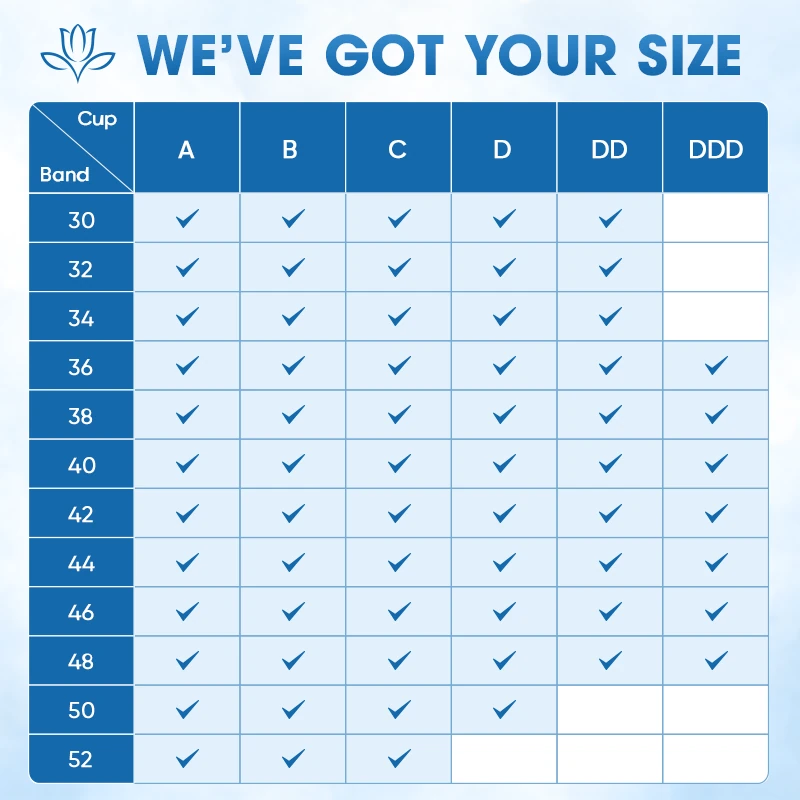 From Cup A to G! Band 30 to 58. Our wide range of sizes ensures a comfortable, supportive fit that flatters your shape. Because every woman deserves a bra that feels like it was made just for her!